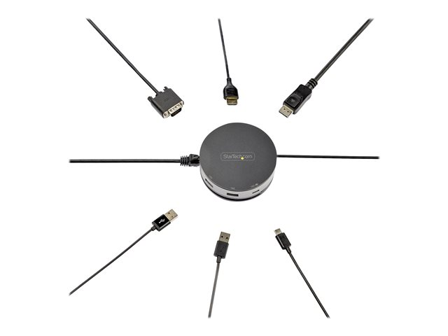 Cet adaptateur multiport USB-C Gen 2 10 Gbit/s, compatible avec des ordinateurs portables USB-C plus anciens, transforme votre pc portable Windows, MacBook Pro, iPad Pro, Surface, Chromebook ou votre tablette Android USB-C & Thunderbolt 3 en une station de travail, où que vous alliez. L'adaptateur de hub USB 3.2 Gen 2 Type-C est doté d'une conception circulaire unique et portable et de toutes les connexions essentielles: • Sories vidéo HDMI, DisplayPort et VGA • Ports périphériques USB-C & USB-A 10 Gbit/s • Câble hôte USB-C de 24 cm (attaché).