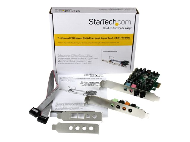 Cette carte son PCI-E 7.1 voies constituera un ajout sonore de qualité à votre home cinéma. Vous vivrez une expérience unique grâce à l'audio optique numérique cristalline de ses ports d'entrée et de sortie SPDIF. Fonctionnement polyvalent Cette carte son polyvalente sert avec un grand nombre d'appareils audio. Et avec sa sortie optique numérique SPDIF ou analogique de 3,5 mm, inutile de vous soucier du type de connexions prises en charge par vos appareils. Envoyez l'audio numérique vers votre récepteur optique ou votre DAC, ou encore l'audio analogique vers votre chaîne audio. Cette carte adaptateur son surround 7.1 aux fonctions de lecture et d'enregistrement jusqu'à 24 bits et 192 kHz produit un son haute définition d'une formidable qualité sonore. Installation simple Contrairement aux cartes son ordinaires, cette carte est conçue pour les ordinateurs compacts et donc, parfaite pour les systèmes HTPC (home cinéma sur PC). Elle répartit les multiples ports sur une carte principale plus un support en-tête novateur distinct. Cette carte comporte des supports standard et faible encombrement (demi-hauteur). Rien de plus facile que d'installer la carte son surround 7.1 voies ! C'est le choix qui s'impose pour quiconque recherche une solution simple pour améliorer le son, comme les amateurs de musique ou les professionnels du mixage. Plusieurs options de sortie Misez sur l'évolutivité en branchant rapidement un microphone ou d'autres dispositifs d'enregistrement dans les deux prises d'entrée stéréo 3,5 mm ou audio numérique SPDIF de votre ordinateur. Le modèle PEXSOUND7CH bénéficie de la garantie StarTech.com de 2 ans et de l'assistance technique à vie gratuite.