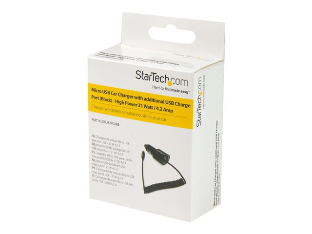 Adaptateur allume cigare avec câble Micro USB et port USB 2.0 - Haute puissance 21W / 4,2A - Adaptateur d'alimentation pour voiture - 21 Watt - 4.2 A - 2 connecteurs de sortie (USB, Micro-USB de type B) - sur le câble : Micro-USB - noir - pour P/N: USBLT1MW, USBLT1MWS, USBLT2MBR, USBLT2MW, USBLT30CMW, USBLTM1MBK, USBLTM1MWH