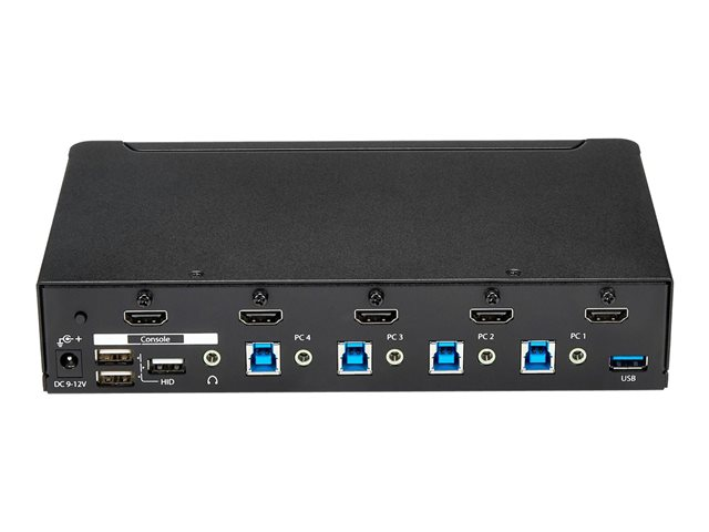 Ce commutateur KVM USB 3.0 HDMI à 4 ports vous permet de contrôler quatre ordinateurs HDMI avec un seul jeu de clavier, souris et moniteur. Le KVM comporte aussi l'audio 3,5 mm et un hub USB 3.0 à 3 ports intégré.
