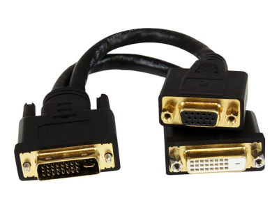 Le câble répartiteur Wyse DVI DVI92030202L est doté d'un connecteur DVI-I mâle qui se divise en un câble DVI-D femelle et en un câble HD15 VGA femelle, ce qui vous permet de brancher simultanément un écran DVI-D et un écran VGA à votre terminal Wyse.