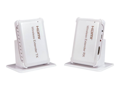 Cet extendeur permet de diffuser une source audio et vidéo Full HD sans fil. La portée maximale est de 30 mètres ce qui permet une grande distance entre les deux appareils. Cet extendeur HDMI permet de diffuser des sources en full HD. Il s'utilise uniquement à l'intérieur d'une même pièce (ne traverse pas les murs et les cloisons). Utilisant une technologie haute fréquence, le signal n'est pas perturbé par les autres signaux sans fil. Cette référence comprend le couple Emetteur + Récepteur pour une utilisation immédiate du produit.